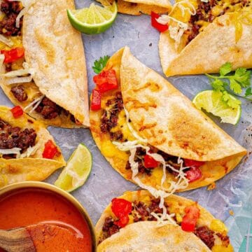 I love serving them with a side of beans and jalapeño rice for a little pop of heat. A warm bowl of cheese dip with ground beef makes the perfect creamy contrast for those crispy shells.